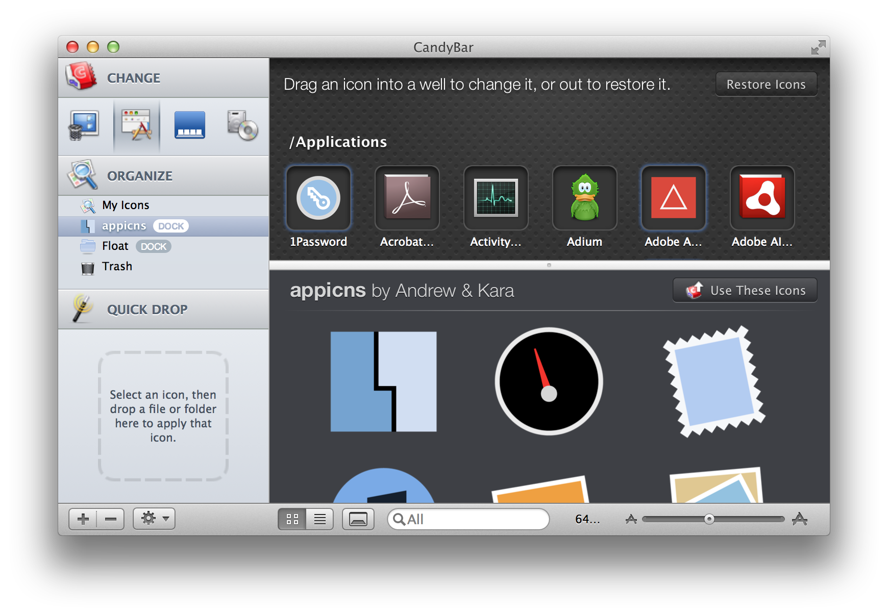 First off, I downloaded the iconset and opened it with Candybar. This is a nifty tool by Panic for managing and updating icons in OSX. They no longer support it, however this also means its free! I believe they are handing the reigns over to Iconfactory, so we’ll see what the future holds.