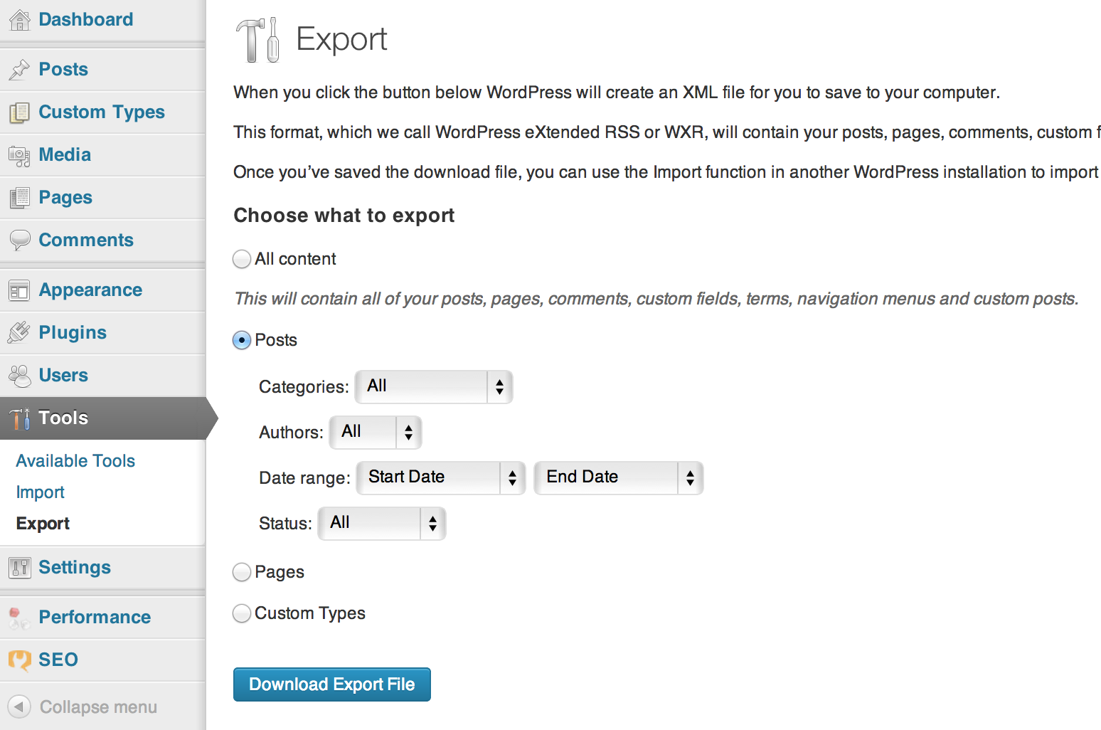 First, I needed to export my posts from my current blog. To do this, I downloaded an export xml file locally. In the admin area of my WordPress install, I headed to: