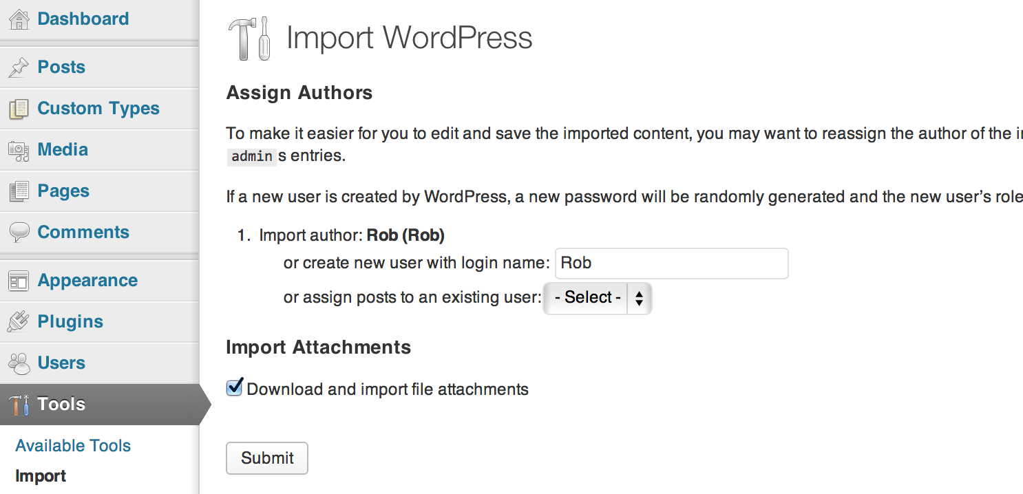 As you can see above, I chose to create a new user to apply all my posts to. WordPress will give you this option for any users you have in the xml file. I also moved all my attachments over.